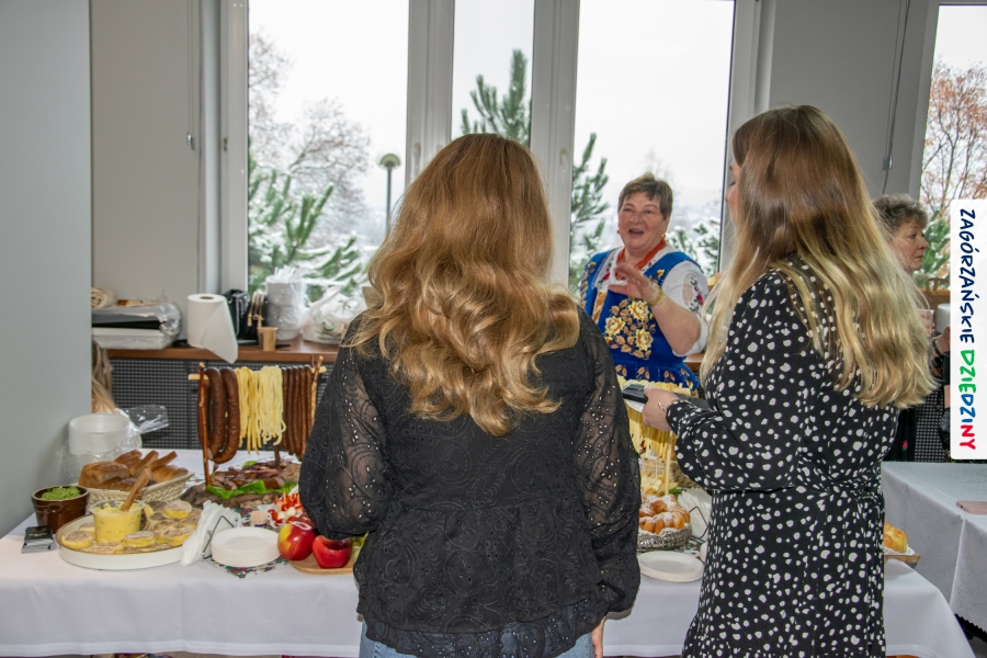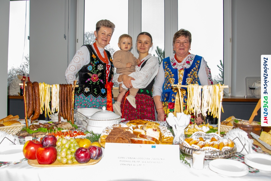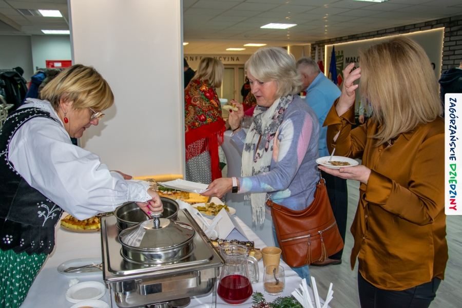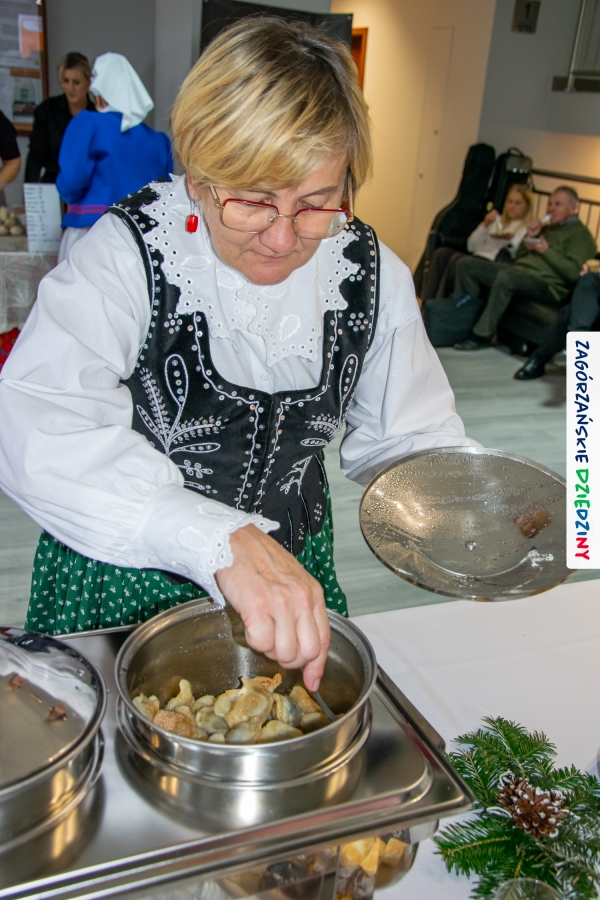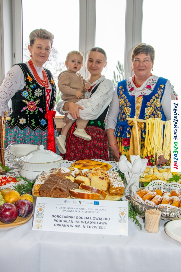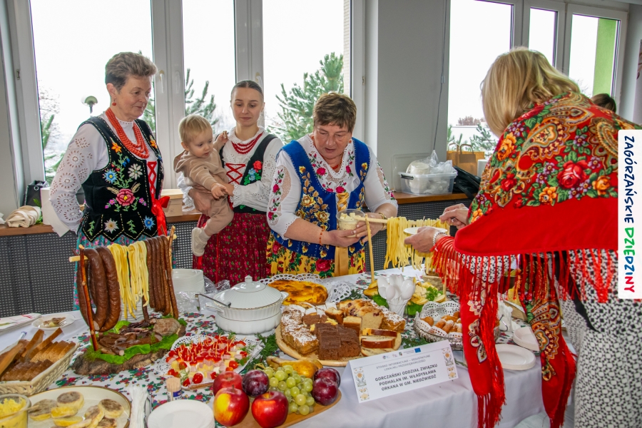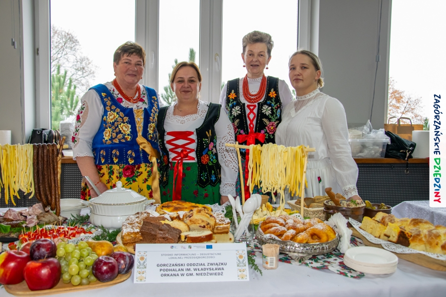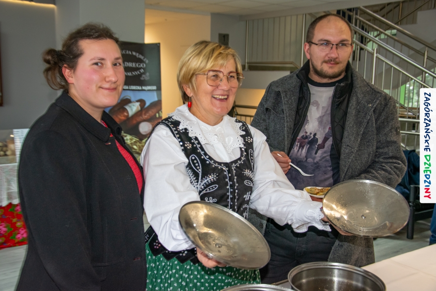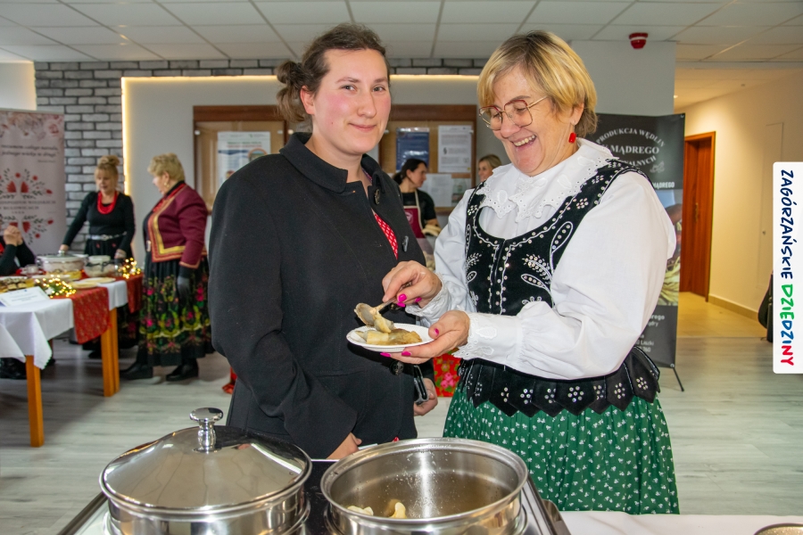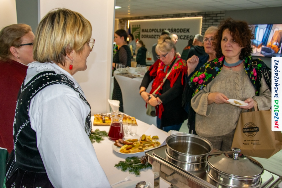 Znane ze swojej znakomitej kuchni łętowanki zawojowały wydarzenie pierogami z suszonymi śliwkami, które w 2021 r. wpisały na Listę Produktów Tradycyjnych Ministerstwa Rolnictwa i Rozwoju Wsi. Ustawiały się po nie kolejki! Wszyscy, bez wyjątku, zachwycali się ich aromatem, dopytywali o sekret smaku i podchodzili po dokładkę! Zapasy szybko topniały, a w garnku pokazało się dno… Ci, którzy przyszli do stoiska Zagórzańskich Dziedzin już pod koniec wydarzenia, niestety nie załapali się na ten świąteczny poczęstunek…. Nie odeszli jednak głodni. Śwarne Babki częstowały również przepysznymi Gorczańskimi serami podpuszczkowymi od Moniki Kubik, kanapeczkami ze smalczykiem i kiszonym ogórkiem (wszystko z własnego wyrobu!), a także domowymi ciastami. Stoły uginały się również od pyszności u innych gospodyń: @Koło Gospodyń Wiejskich w Głębowicach, @Koło Gospodyń Wiejskich Bulowice oraz u naszych sąsiadek zza miedzy, reprezentujących Gorczański Związek Podhalan im. Władysława Orkana. Nęcił też zapach kiełbasy lisieckiej i innych wyrobów regionalnych od Mądrego.