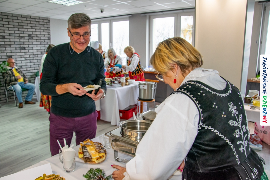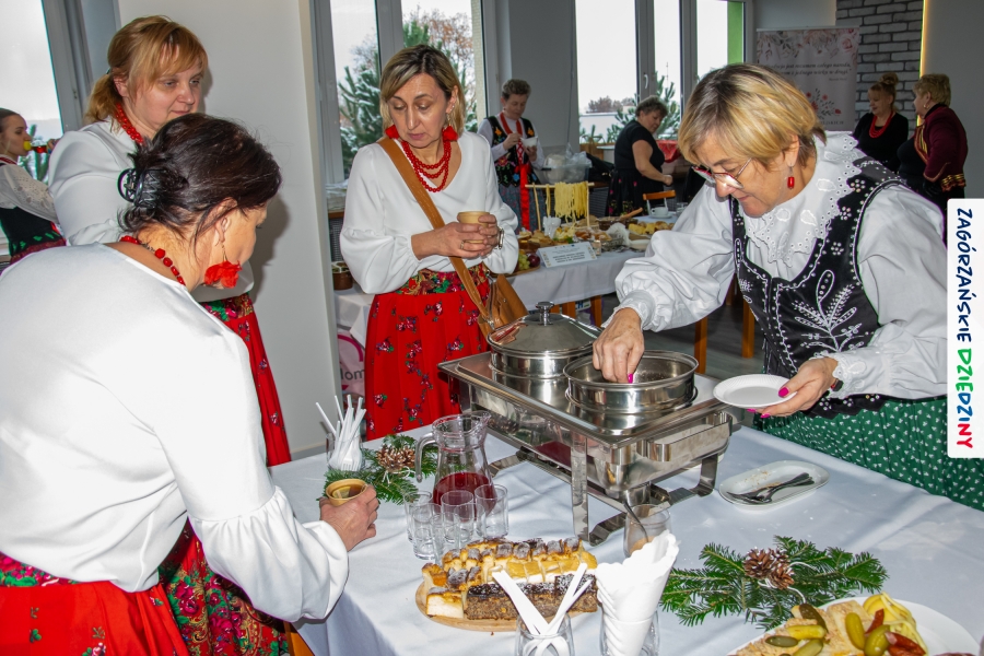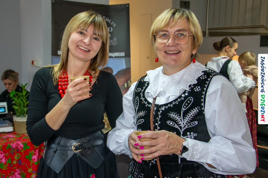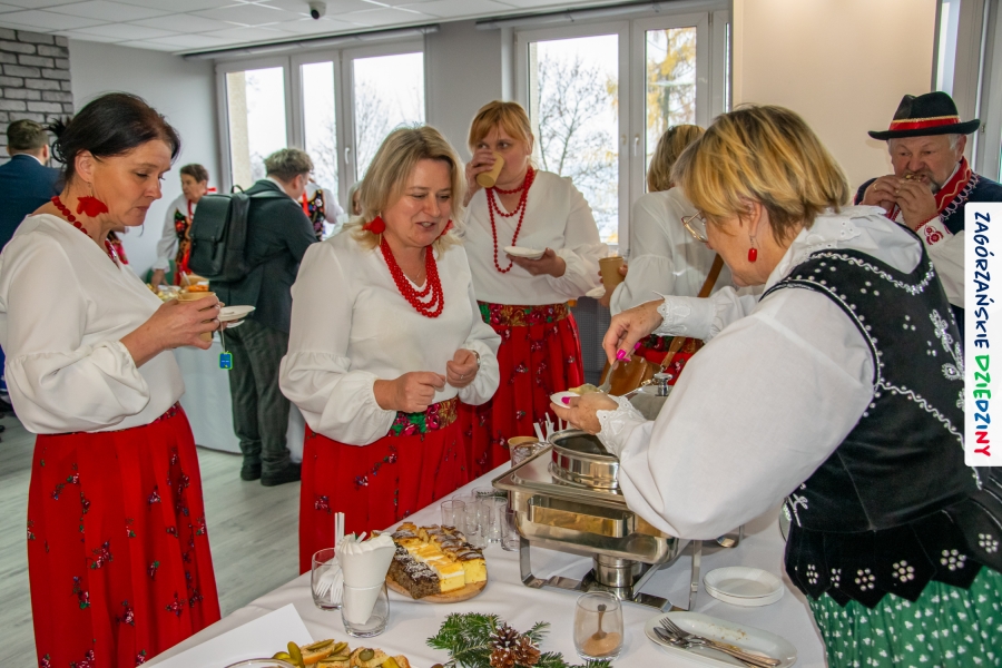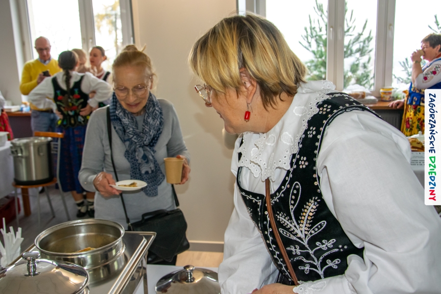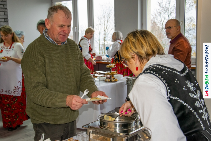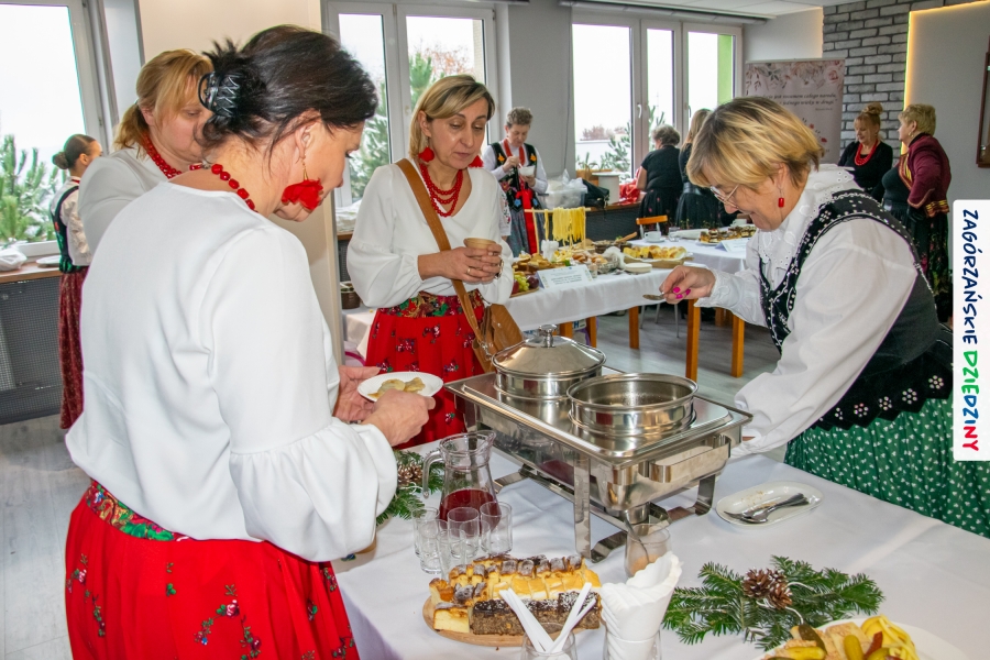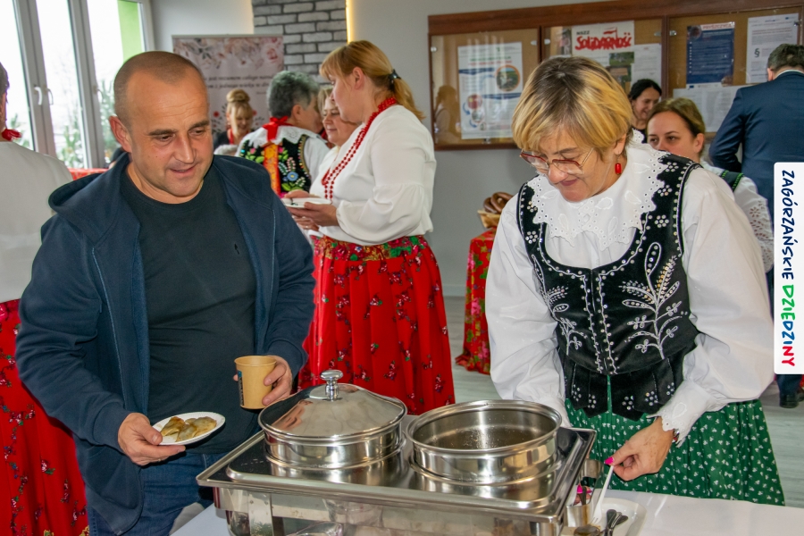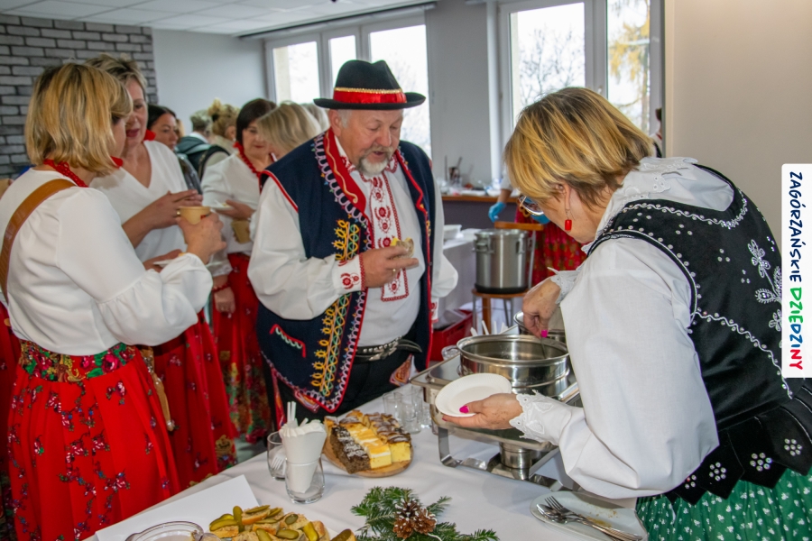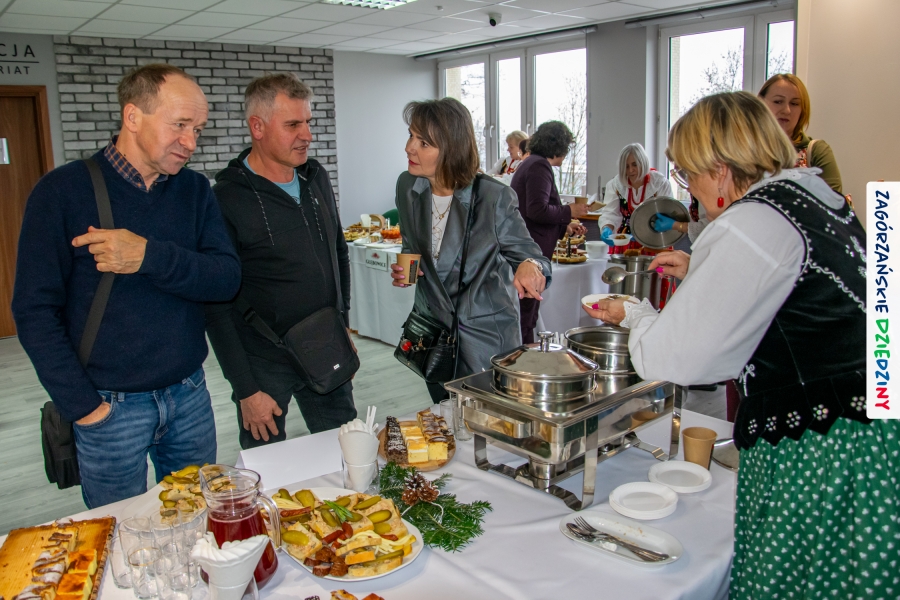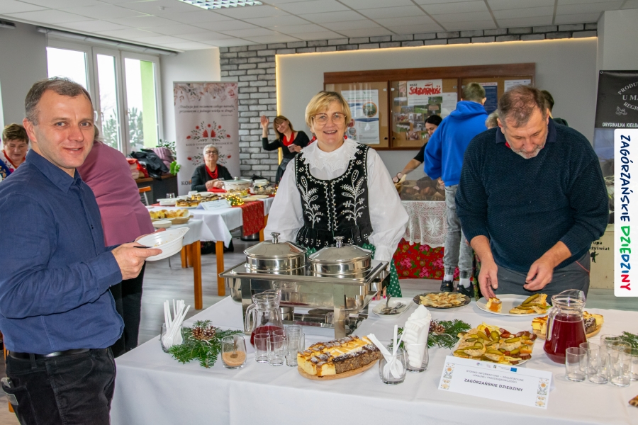 Znane ze swojej znakomitej kuchni łętowanki zawojowały wydarzenie pierogami z suszonymi śliwkami, które w 2021 r. wpisały na Listę Produktów Tradycyjnych Ministerstwa Rolnictwa i Rozwoju Wsi. Ustawiały się po nie kolejki! Wszyscy, bez wyjątku, zachwycali się ich aromatem, dopytywali o sekret smaku i podchodzili po dokładkę! Zapasy szybko topniały, a w garnku pokazało się dno… Ci, którzy przyszli do stoiska Zagórzańskich Dziedzin już pod koniec wydarzenia, niestety nie załapali się na ten świąteczny poczęstunek…. Nie odeszli jednak głodni. Śwarne Babki częstowały również przepysznymi Gorczańskimi serami podpuszczkowymi od Moniki Kubik, kanapeczkami ze smalczykiem i kiszonym ogórkiem (wszystko z własnego wyrobu!), a także domowymi ciastami. Stoły uginały się również od pyszności u innych gospodyń: @Koło Gospodyń Wiejskich w Głębowicach, @Koło Gospodyń Wiejskich Bulowice oraz u naszych sąsiadek zza miedzy, reprezentujących Gorczański Związek Podhalan im. Władysława Orkana. Nęcił też zapach kiełbasy lisieckiej i innych wyrobów regionalnych od Mądrego.