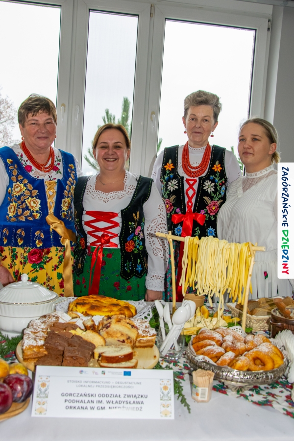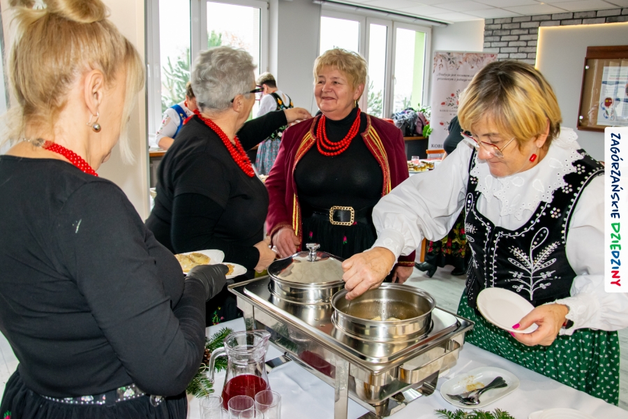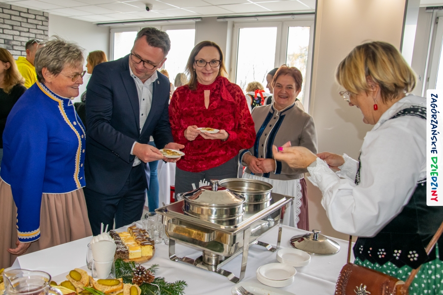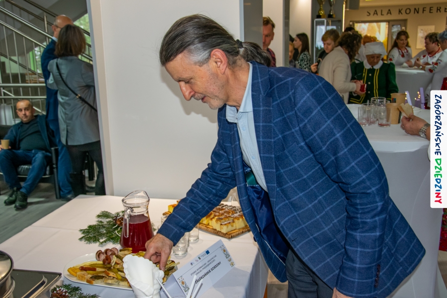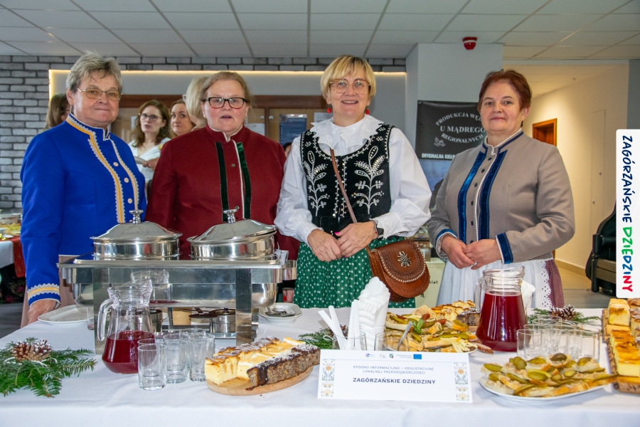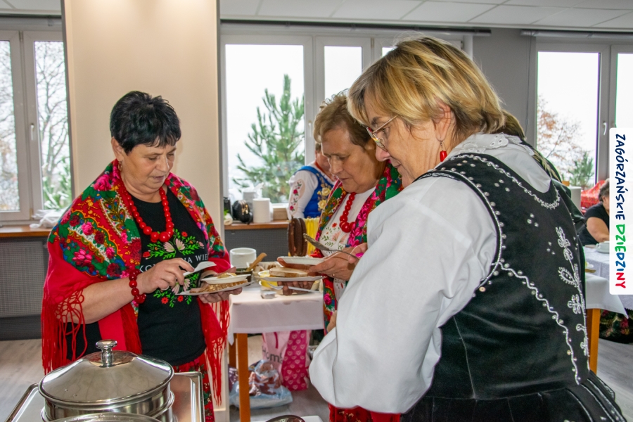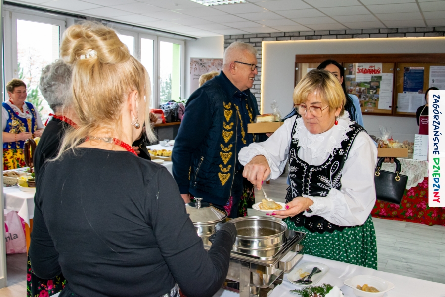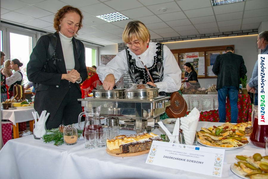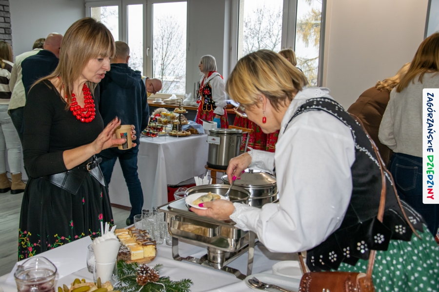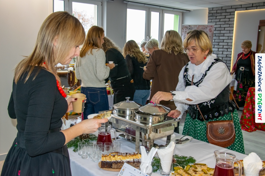 Znane ze swojej znakomitej kuchni łętowanki zawojowały wydarzenie pierogami z suszonymi śliwkami, które w 2021 r. wpisały na Listę Produktów Tradycyjnych Ministerstwa Rolnictwa i Rozwoju Wsi. Ustawiały się po nie kolejki! Wszyscy, bez wyjątku, zachwycali się ich aromatem, dopytywali o sekret smaku i podchodzili po dokładkę! Zapasy szybko topniały, a w garnku pokazało się dno… Ci, którzy przyszli do stoiska Zagórzańskich Dziedzin już pod koniec wydarzenia, niestety nie załapali się na ten świąteczny poczęstunek…. Nie odeszli jednak głodni. Śwarne Babki częstowały również przepysznymi Gorczańskimi serami podpuszczkowymi od Moniki Kubik, kanapeczkami ze smalczykiem i kiszonym ogórkiem (wszystko z własnego wyrobu!), a także domowymi ciastami. Stoły uginały się również od pyszności u innych gospodyń: @Koło Gospodyń Wiejskich w Głębowicach, @Koło Gospodyń Wiejskich Bulowice oraz u naszych sąsiadek zza miedzy, reprezentujących Gorczański Związek Podhalan im. Władysława Orkana. Nęcił też zapach kiełbasy lisieckiej i innych wyrobów regionalnych od Mądrego.