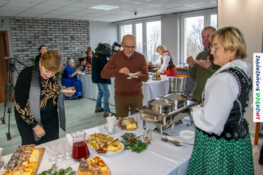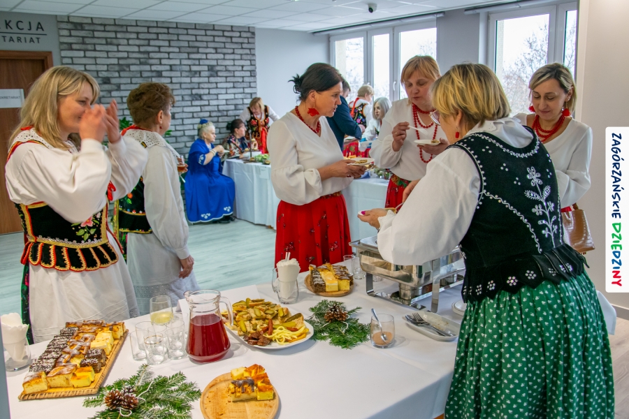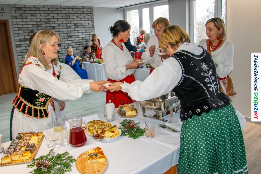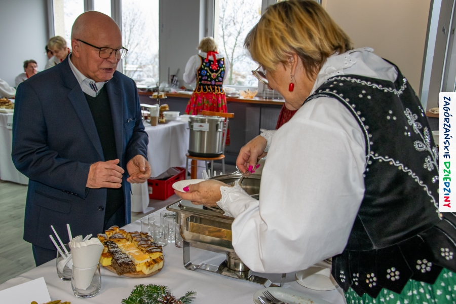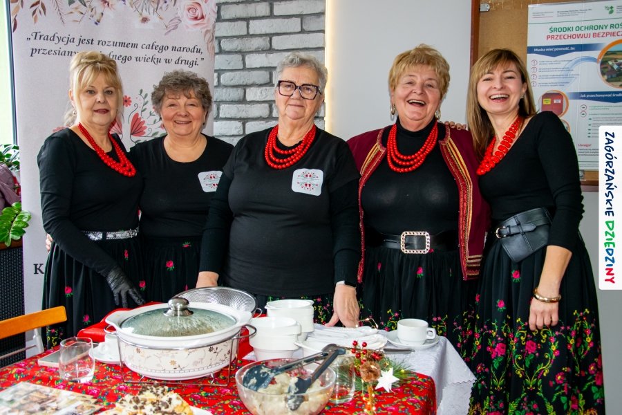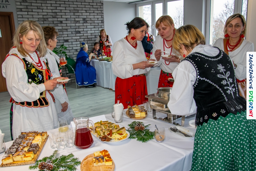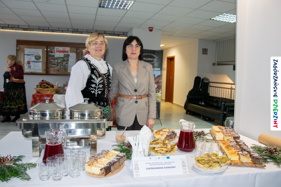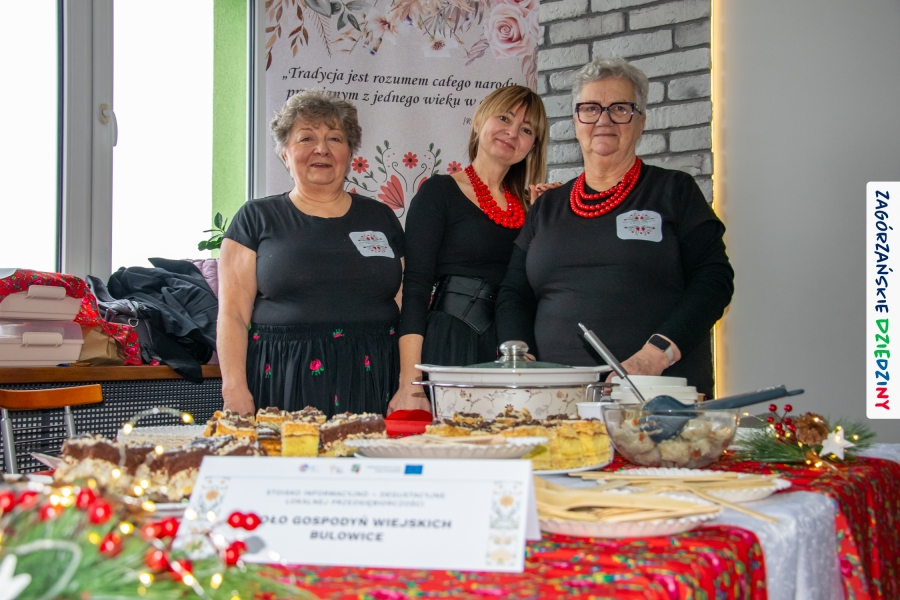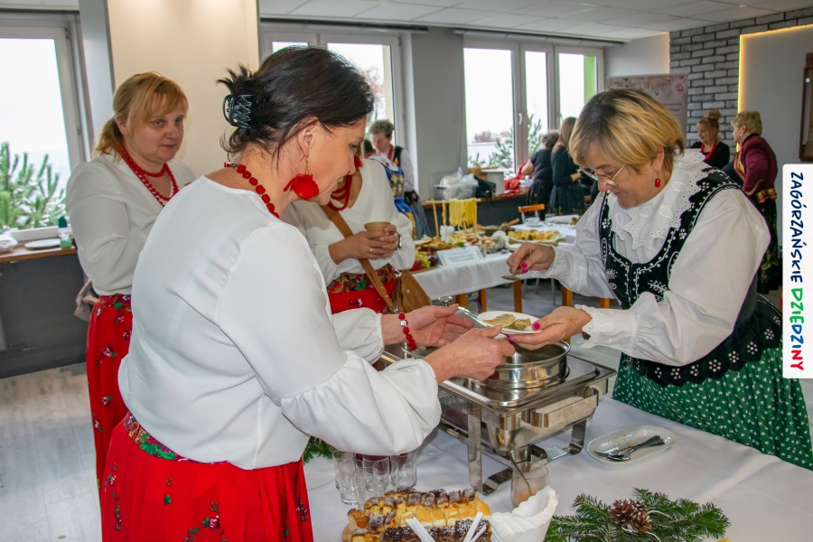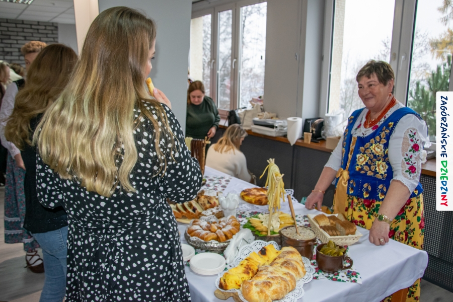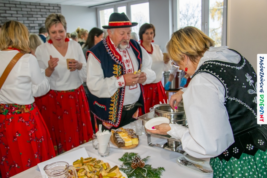Znane ze swojej znakomitej kuchni łętowanki zawojowały wydarzenie pierogami z suszonymi śliwkami, które w 2021 r. wpisały na Listę Produktów Tradycyjnych Ministerstwa Rolnictwa i Rozwoju Wsi. Ustawiały się po nie kolejki! Wszyscy, bez wyjątku, zachwycali się ich aromatem, dopytywali o sekret smaku i podchodzili po dokładkę! Zapasy szybko topniały, a w garnku pokazało się dno… Ci, którzy przyszli do stoiska Zagórzańskich Dziedzin już pod koniec wydarzenia, niestety nie załapali się na ten świąteczny poczęstunek…. Nie odeszli jednak głodni. Śwarne Babki częstowały również przepysznymi Gorczańskimi serami podpuszczkowymi od Moniki Kubik, kanapeczkami ze smalczykiem i kiszonym ogórkiem (wszystko z własnego wyrobu!), a także domowymi ciastami. Stoły uginały się również od pyszności u innych gospodyń: @Koło Gospodyń Wiejskich w Głębowicach, @Koło Gospodyń Wiejskich Bulowice oraz u naszych sąsiadek zza miedzy, reprezentujących Gorczański Związek Podhalan im. Władysława Orkana. Nęcił też zapach kiełbasy lisieckiej i innych wyrobów regionalnych od Mądrego.
